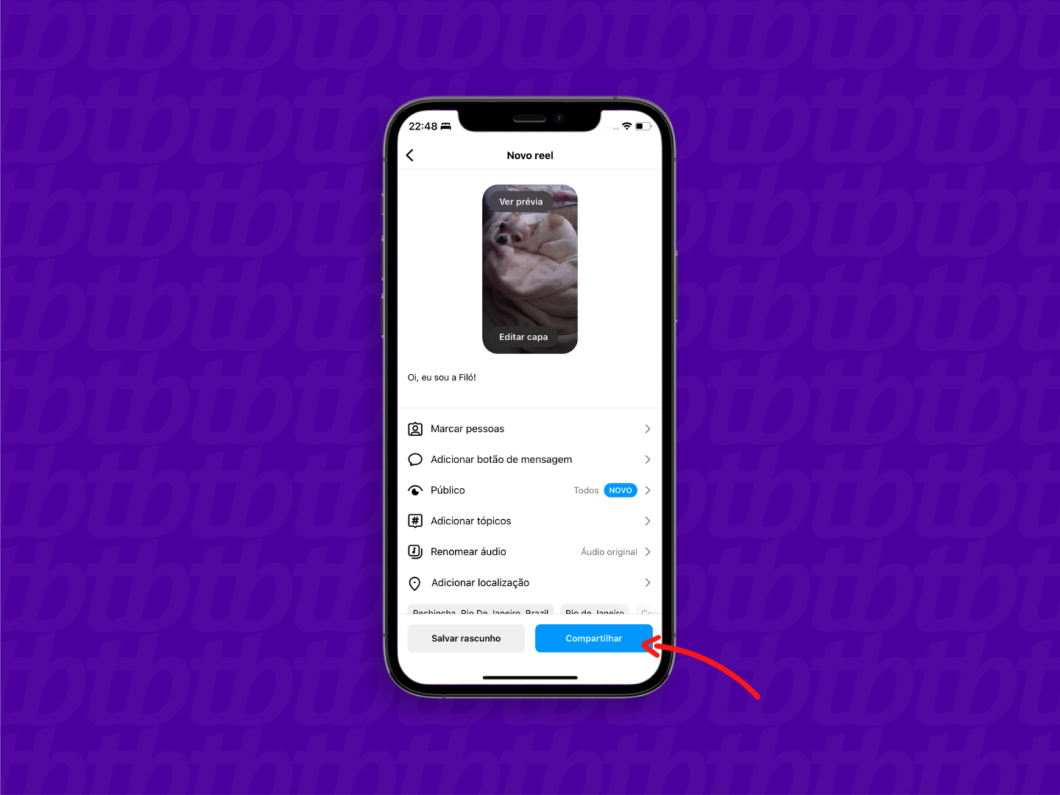 Após definir uma legenda, configurar marcações do reels, a privacidade da publicação e o compartilhamento automático em outras contas, estará tudo pronto para publicar seu reels.