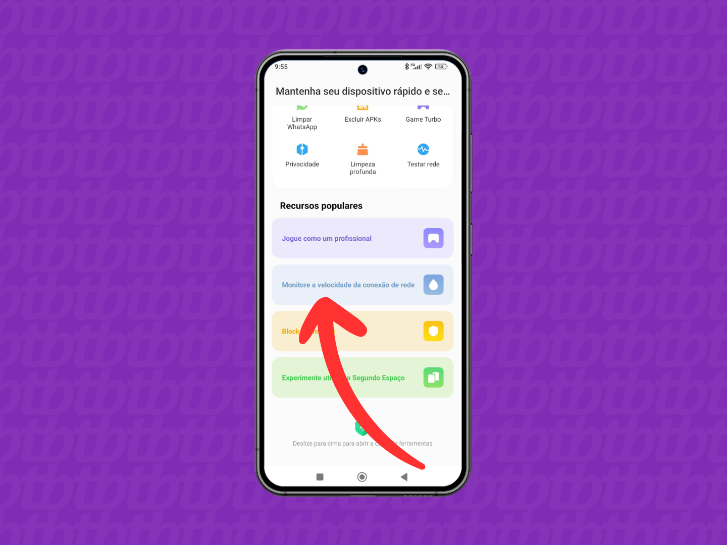 Desça a tela de configurações do app “Segurança” e selecione a opção “Monitore a velocidade de conexão de rede” para avançar.